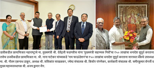 The Bank has donated Rs. 50,00,000/- (Rupees Fifty lakh) each to the Chief Minister’s Drought Relief Fund, Maharashtra and to the NAAM Foundation, an NGO started by actors Nana Patekar and MakarandAnaspure, specifically aimed at alleviating the impact of drought. Mr. Gautam E. Thakur, Vice Chairman handed over the cheque of Rs. 50,00,000/- to Hon’ble Chief Minister of Maharashtra, Shri DevendraFadnavis at the CM’s residence, ‘Varsha’, along with his colleagues Mr. S.K. Sakhalkar, Chairman; Mr. Kishore Rangnekar, Director; Mr. S.K. Banerji, Managing Director and Mr. A.S. Jain, Chief General Manager.